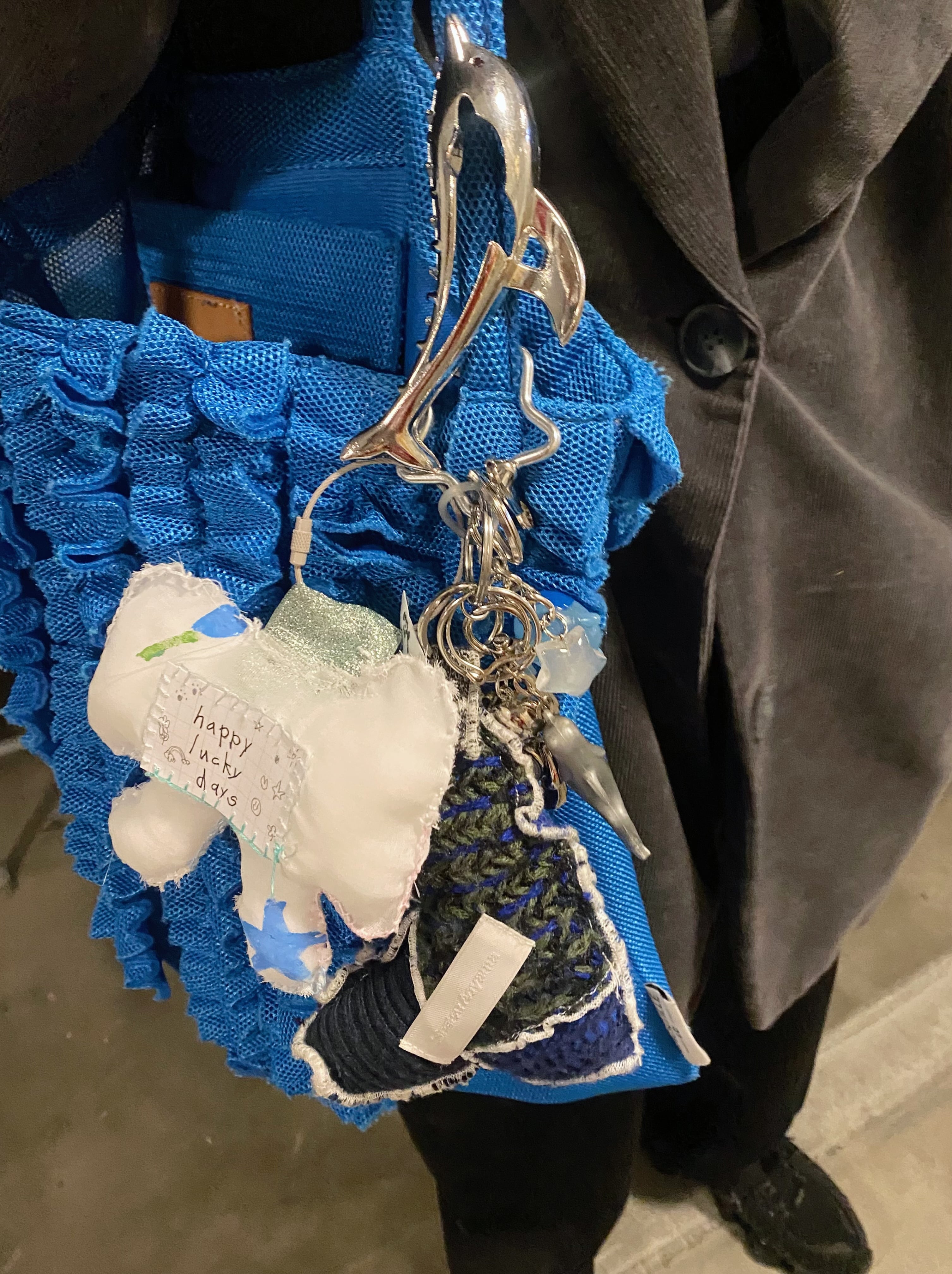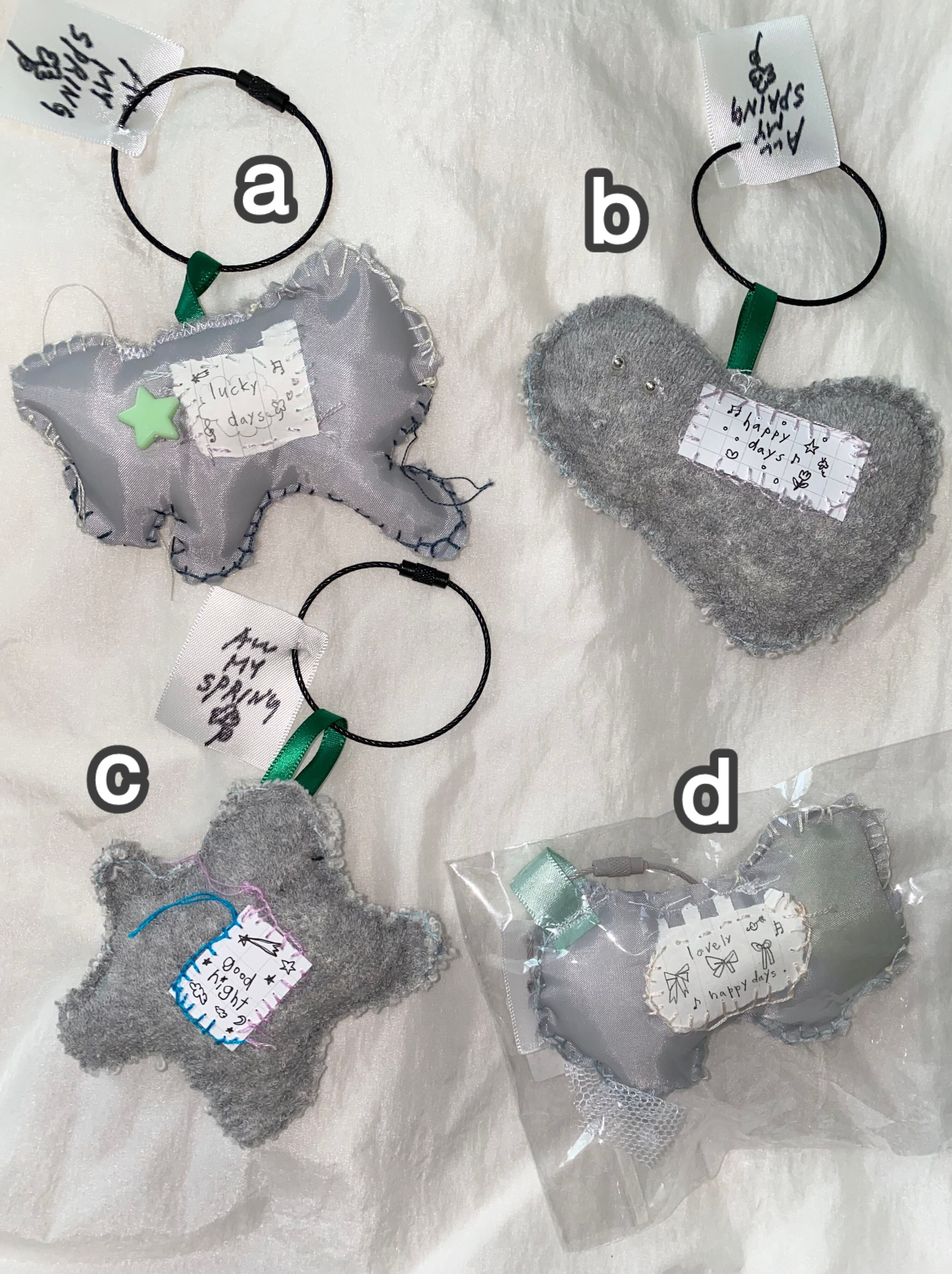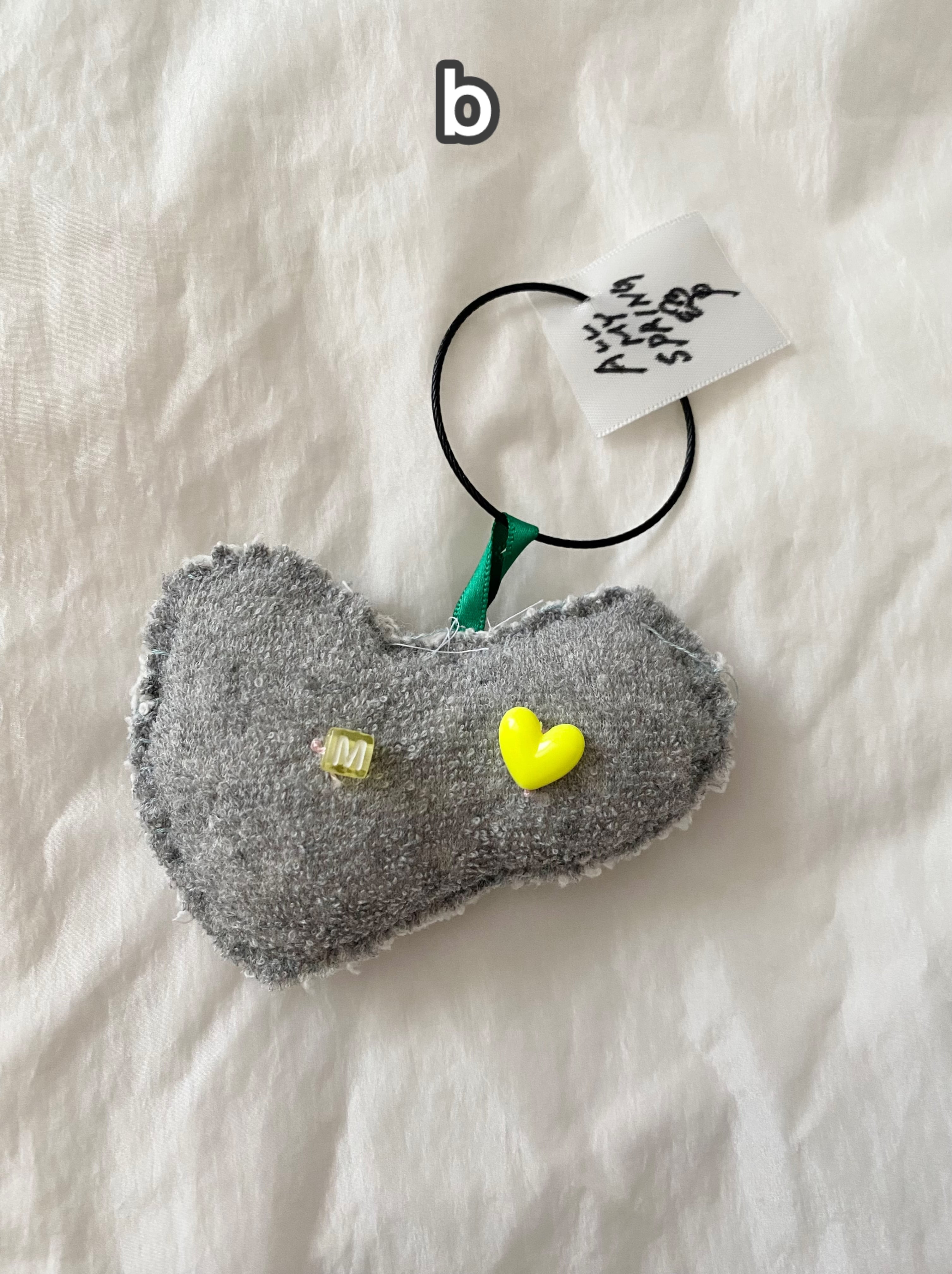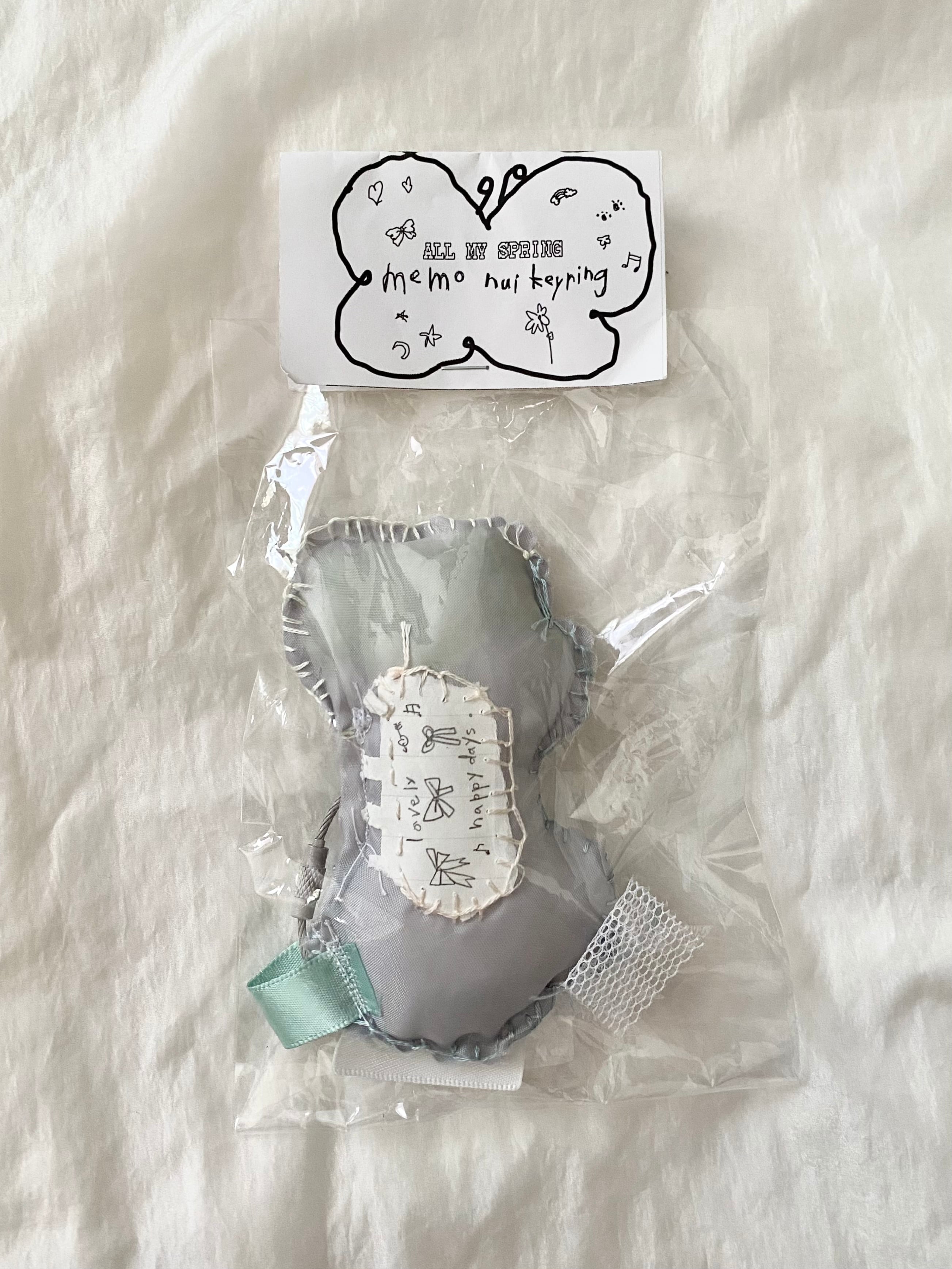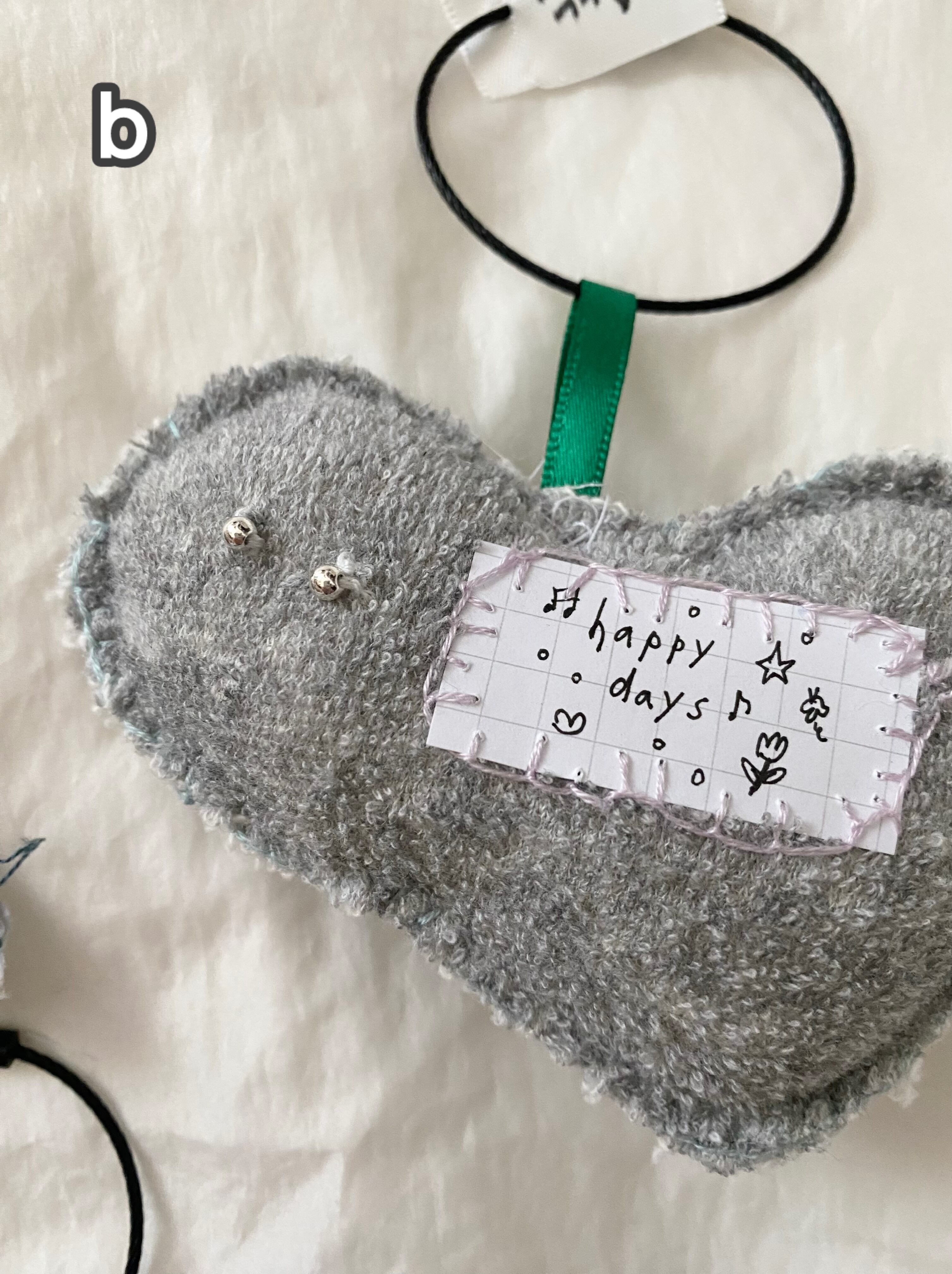 ハッピーラブリーな一言を添えたメモ紙を縫い付けています。雨などの水にはよわいです。