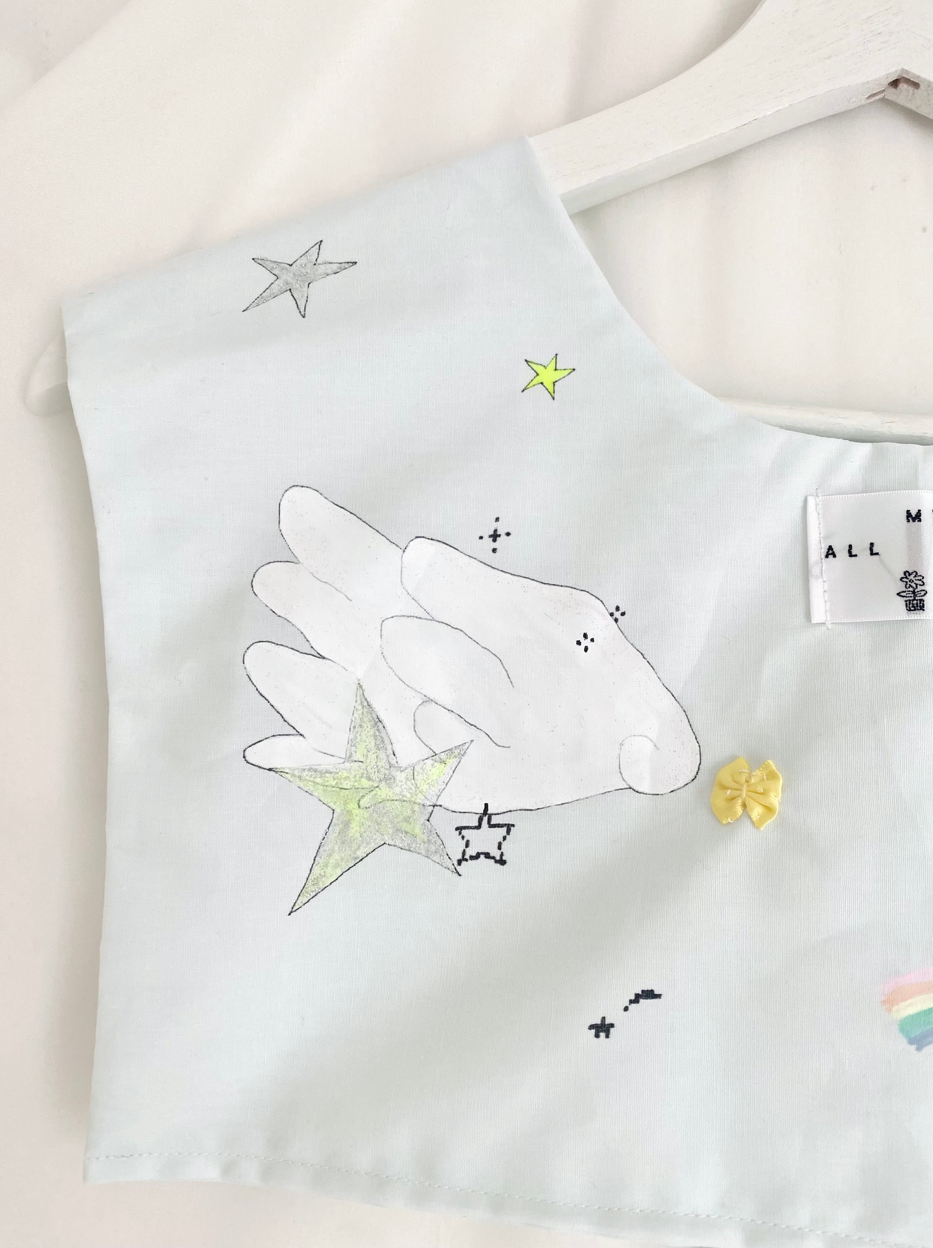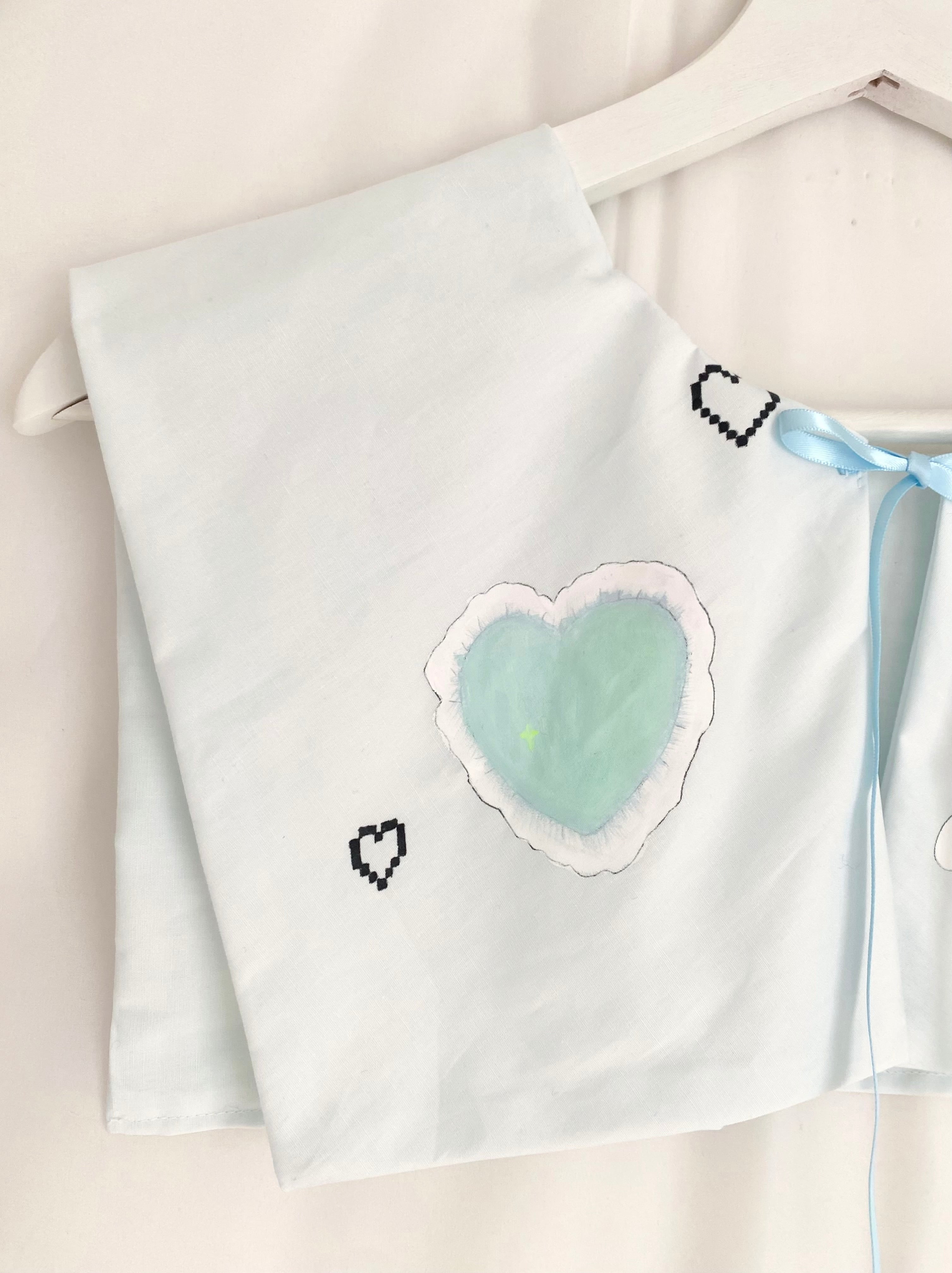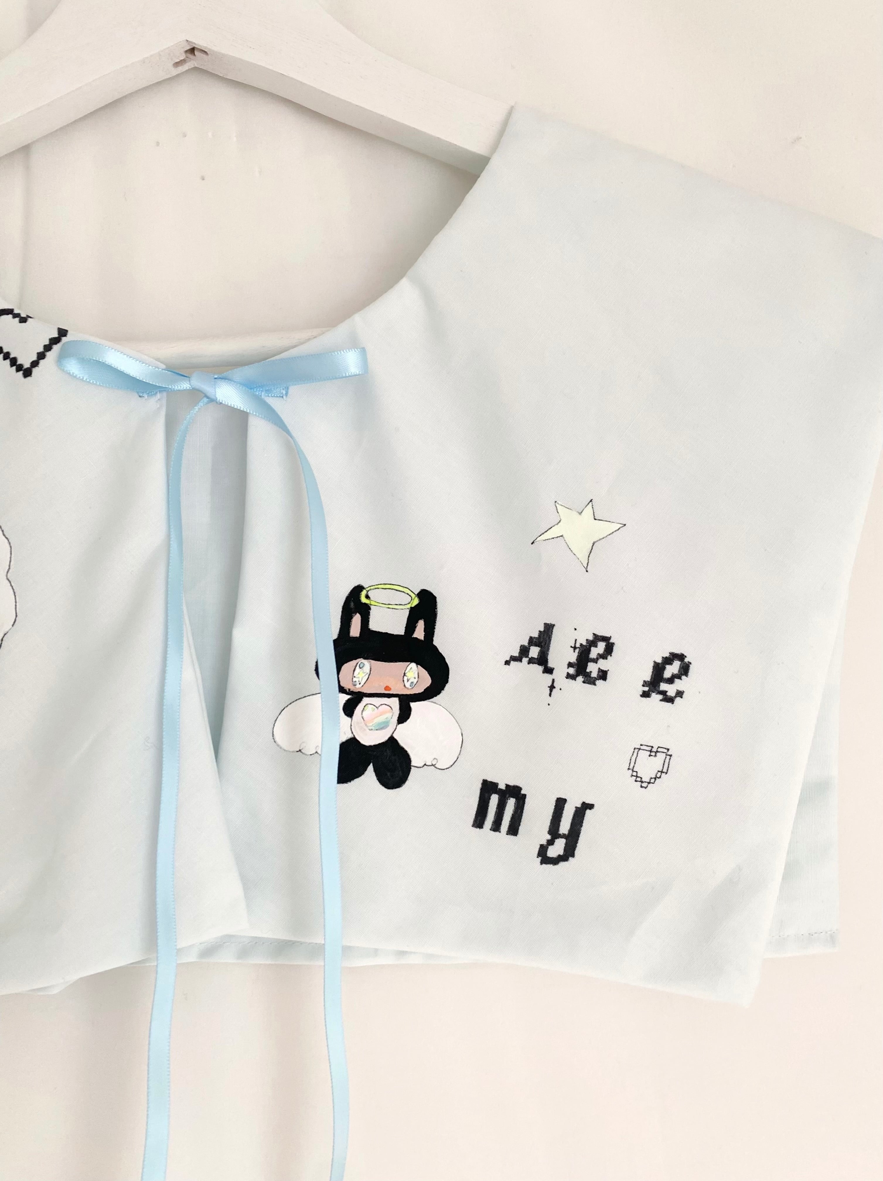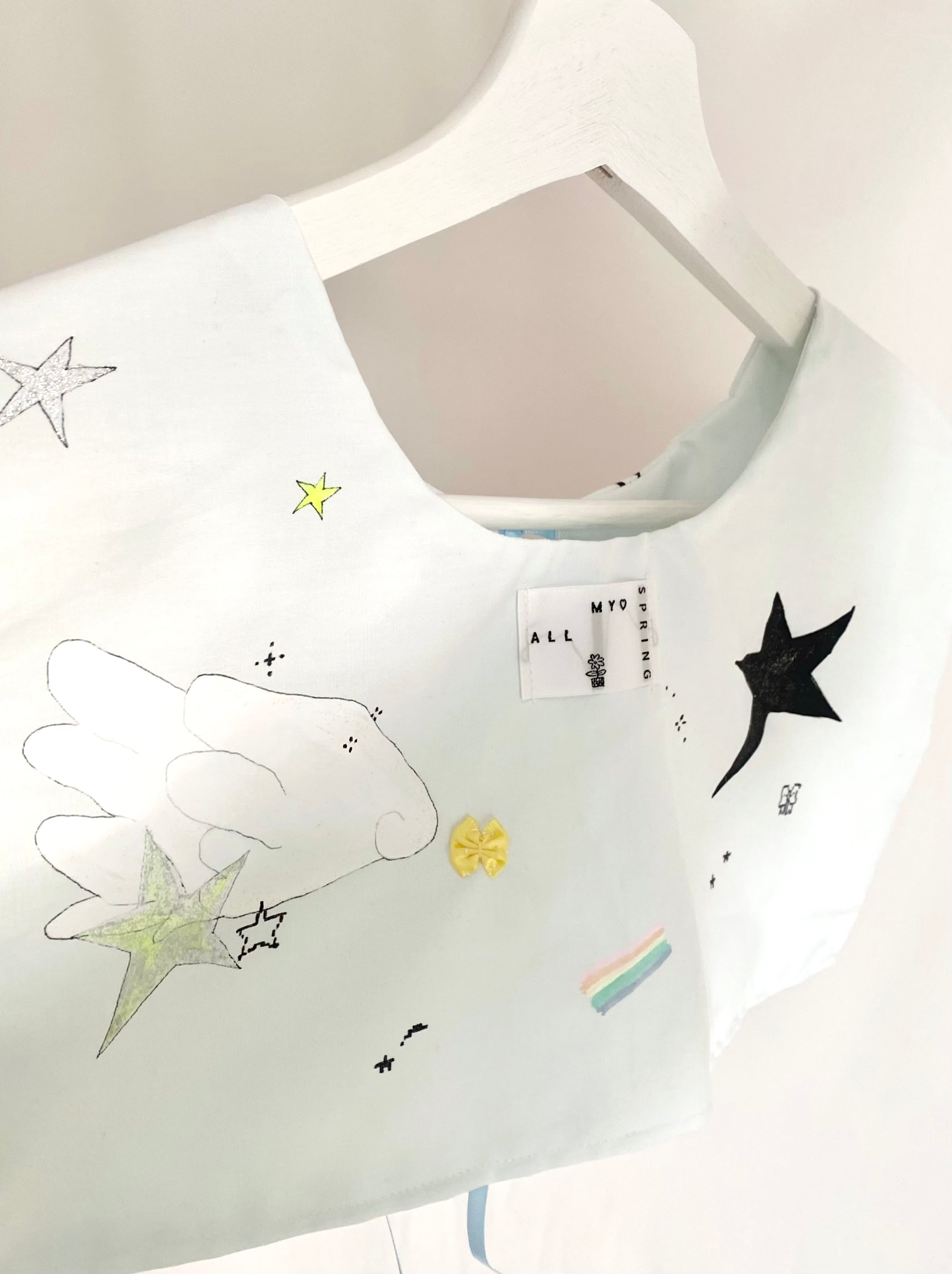ペイントに使用した塗料は洗濯可能のものですが、生地とリボンが繊細なため手洗い推奨です。