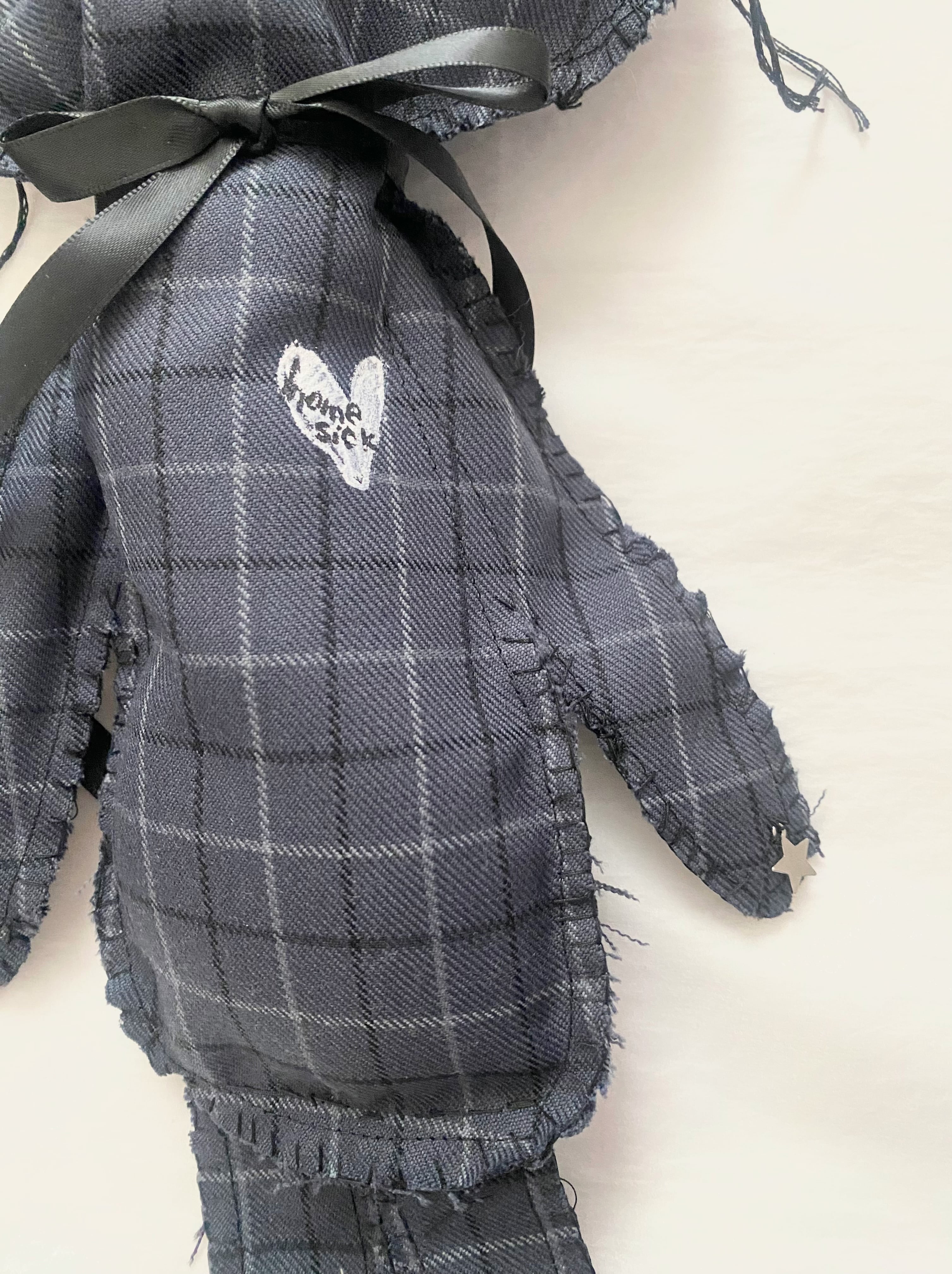 制服、スーツみたいな生地のハギレでつくった大きなひょうちゃんのキーリング.