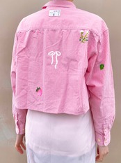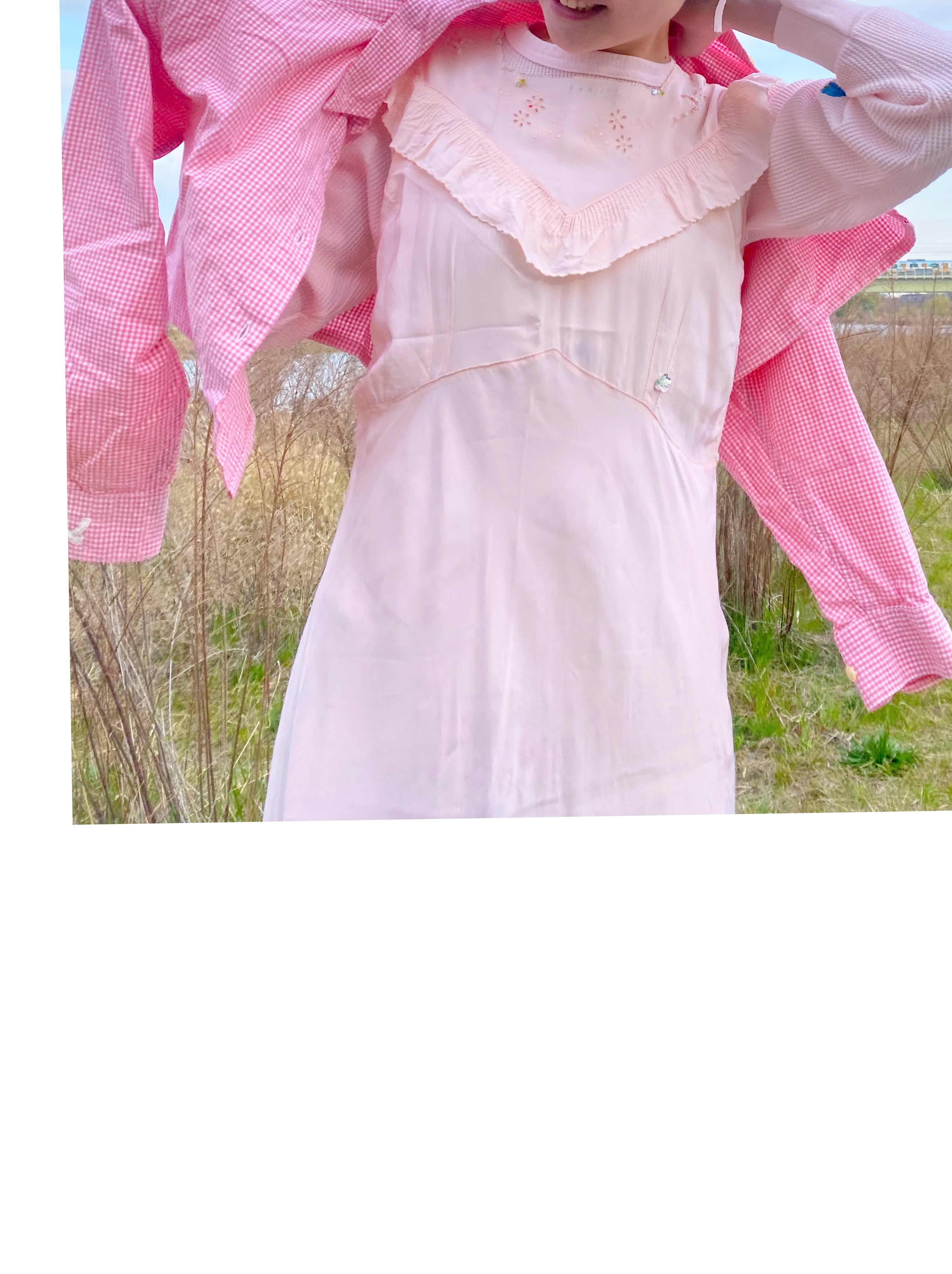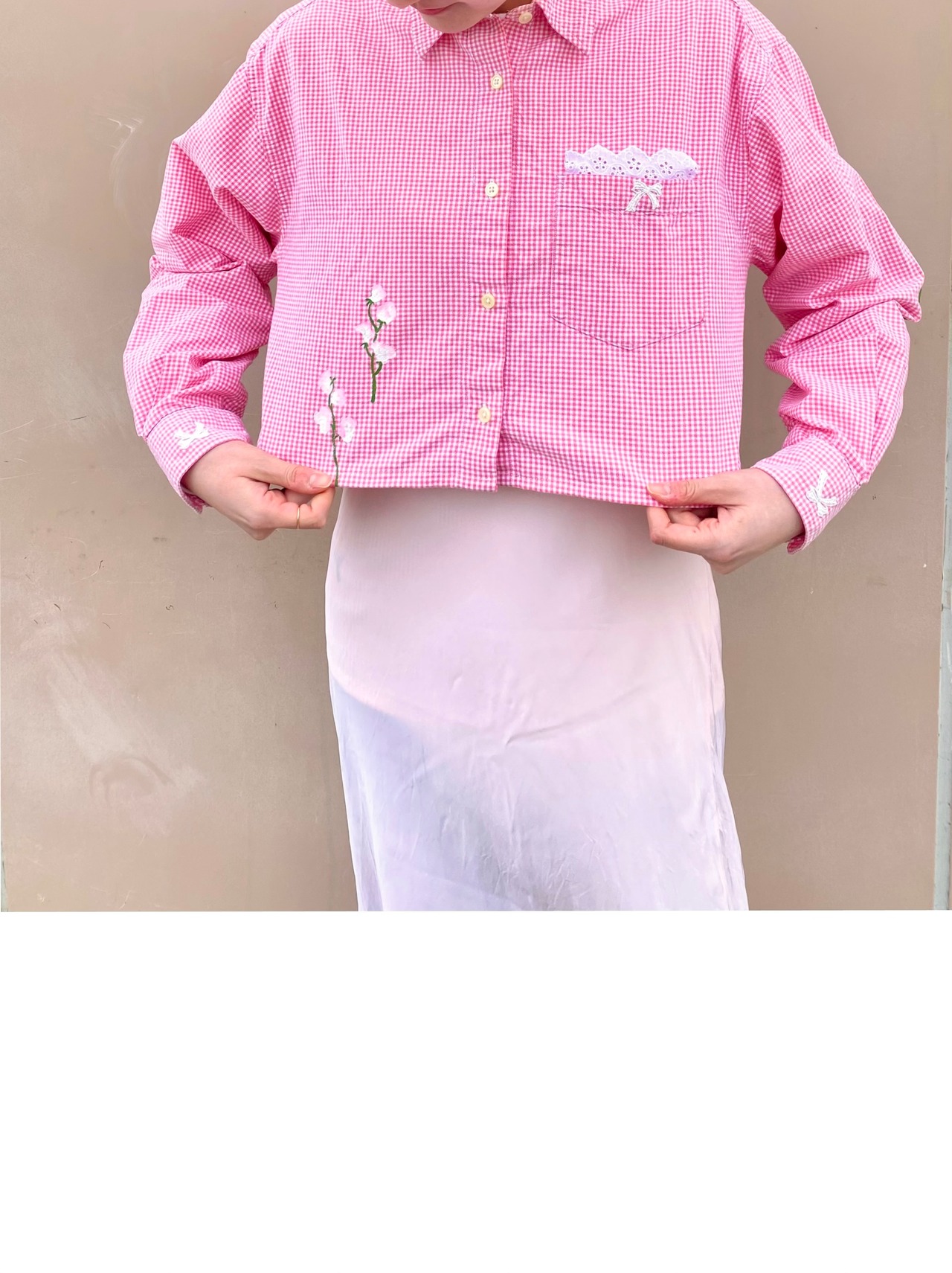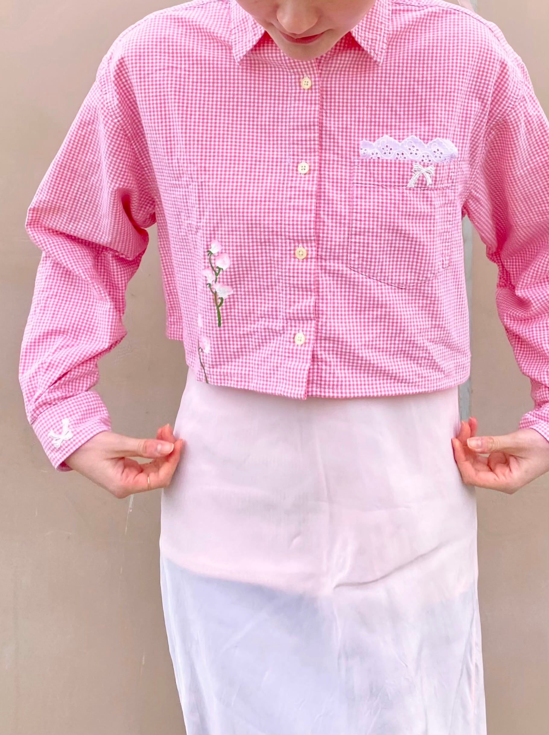 春めくピンク色のギンガムチェックシャツを着やすい着丈に。
